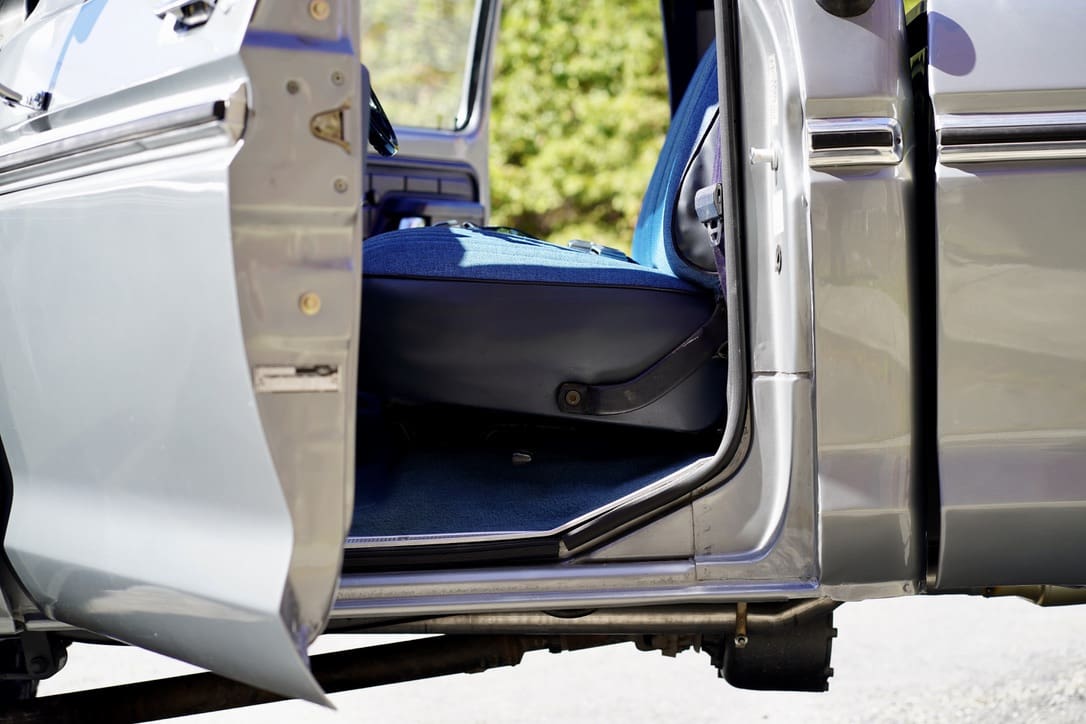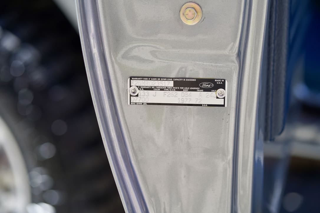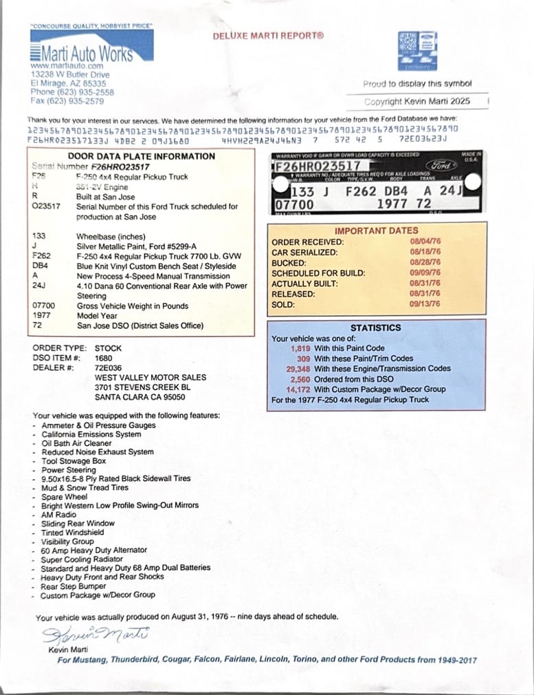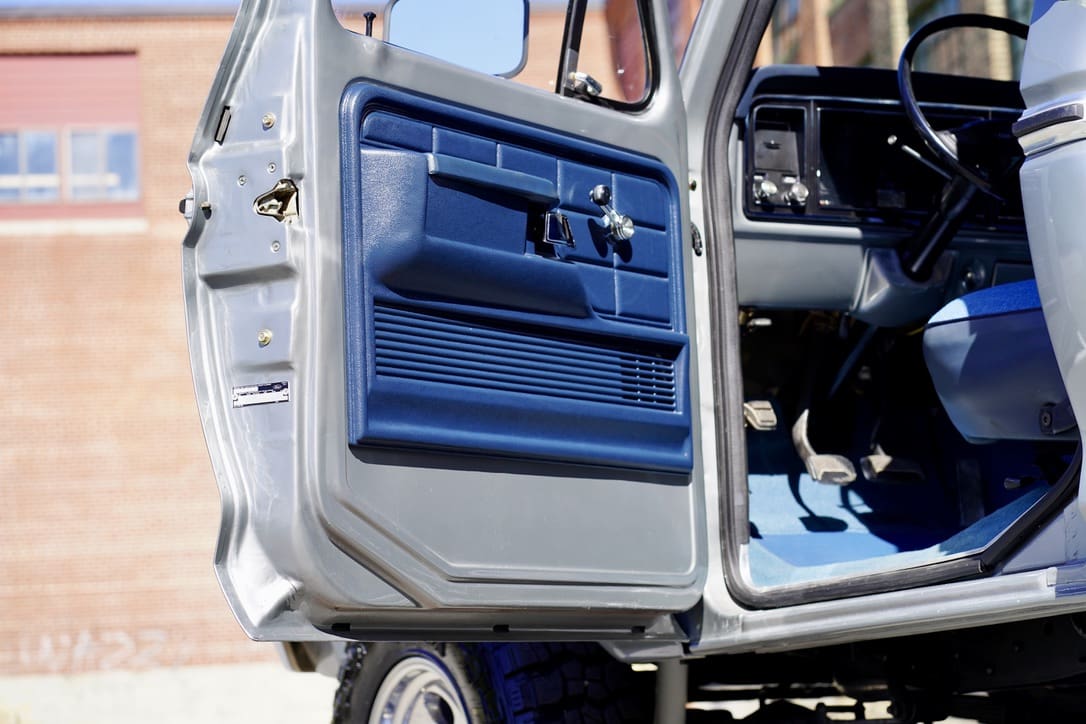 1977 Ford F-250 “Highboy” 4×4. Factory 351cid V8 motor that runs excellent mated to the original 4-speed manual transmission. Dressed in the original colors, “Silver Metallic” paint over the original “Blue Knit Vinyl” Custom bench seat interior in near perfect condition. Marti-report included. Divorced transfer case.